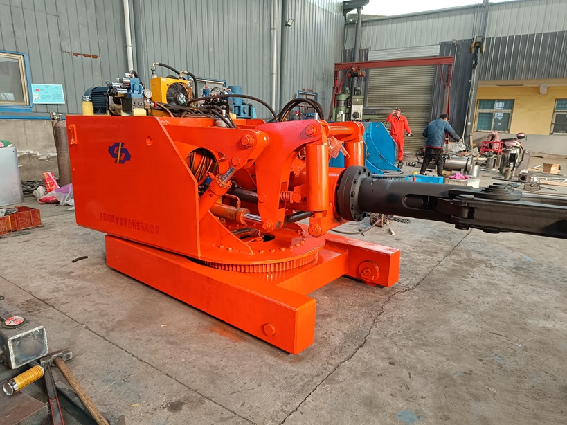 運動系統(tǒng)采用了擺線齒輪馬達和漸開線減速機組合,很好地實現(xiàn)了大車的無級變速行走、臺架回轉(zhuǎn)特殊的夾緊機構(gòu)配以儲能器壓力補償使夾緊有力而穩(wěn)定三級連動機構(gòu)使鉗口平行升降,鉗桿傾斜,360度旋轉(zhuǎn),三維空間任意靈活轉(zhuǎn)動。